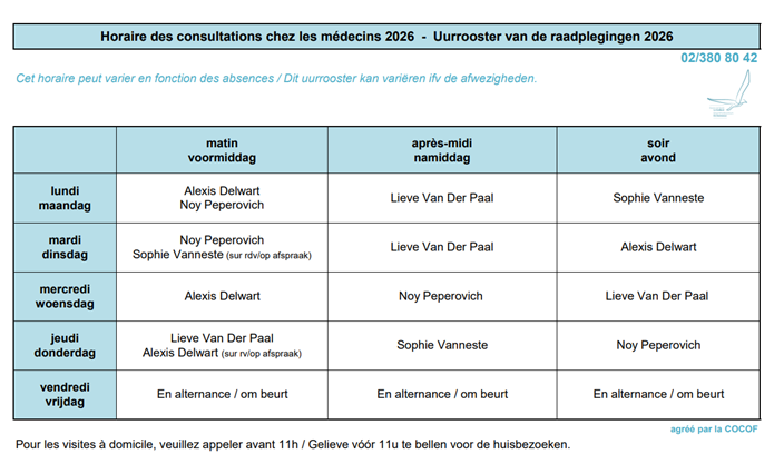 Voici le nouvel horaire de nos médecins (depuis 15/12/25).